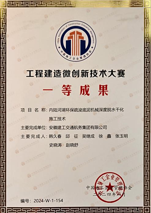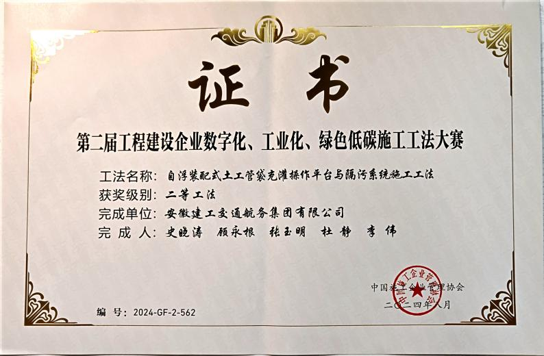 在工程建設(shè)企業(yè)“數(shù)字化、工業(yè)化、綠色低碳”施工工法大賽中,公司申報(bào)的“城市內(nèi)河航道入湖口生態(tài)濕地修復(fù)施工工法”、“自浮裝配式土工管袋充灌操作平臺與隔污系統(tǒng)施工工法”、“重金屬污染土壤異位淋洗施工工法”、“大面積疏浚排泥場對稱沉降滑移控制筑堤施工工法”分別榮獲一等獎、二等獎、三等獎。