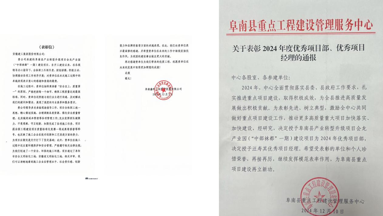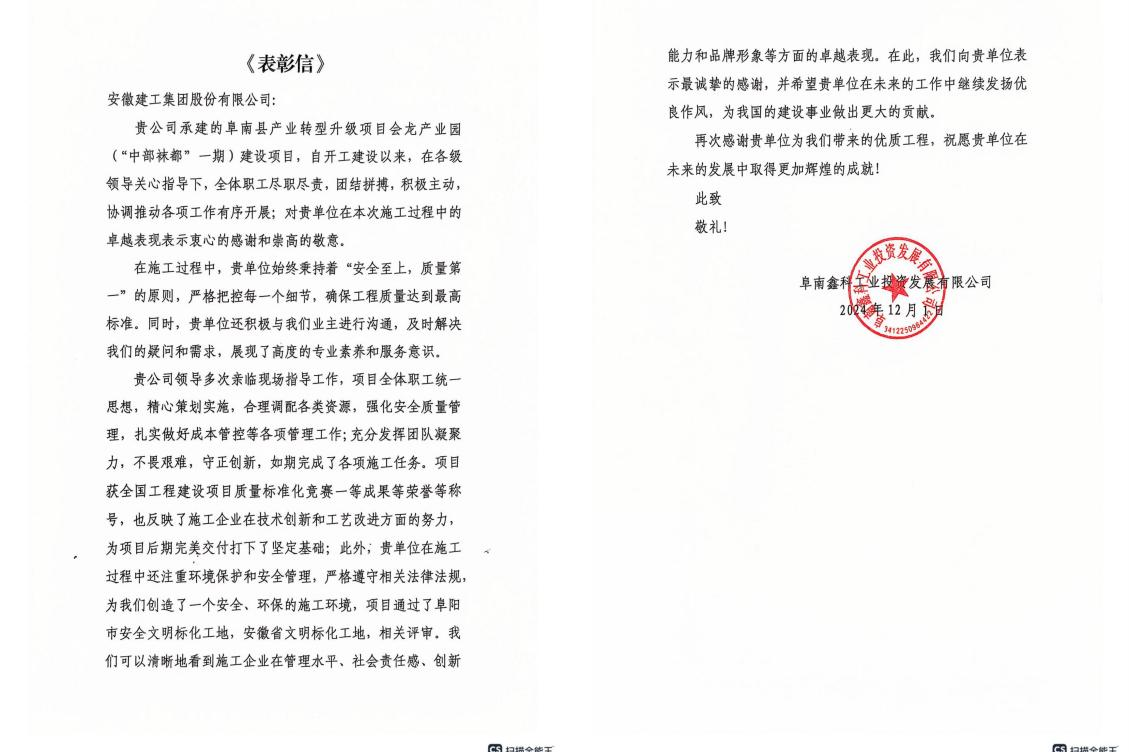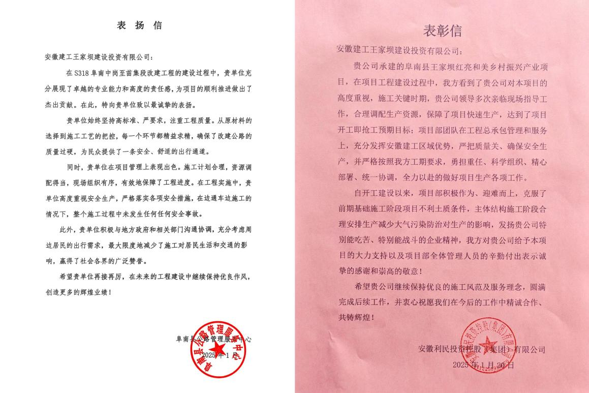 信中指出,安徽建工王家壩建投在項目建設(shè)過程中,全面落實阜南縣委、縣政府工作要求,扎實推進重點項目建設(shè),取得積極成效。為全縣推進高質(zhì)量發(fā)展做出積極貢獻,為阜南縣重點項目建設(shè)再立新功。