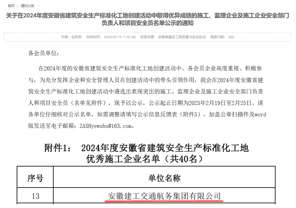 近日,安徽省建筑安全生產(chǎn)標準化工地創(chuàng)建活動結(jié)果揭曉,安徽建工交通航務(wù)集團有限公司憑借扎實的安全管理,斬獲多項殊榮。