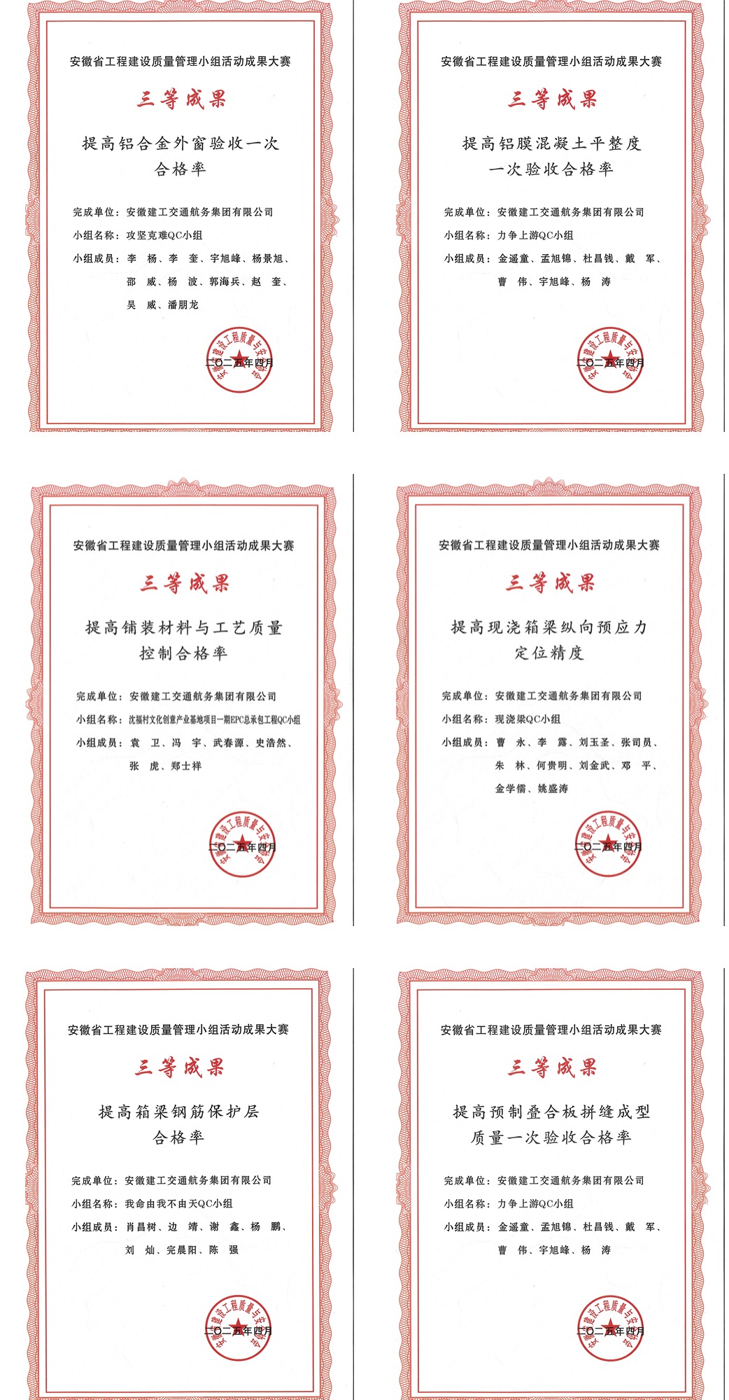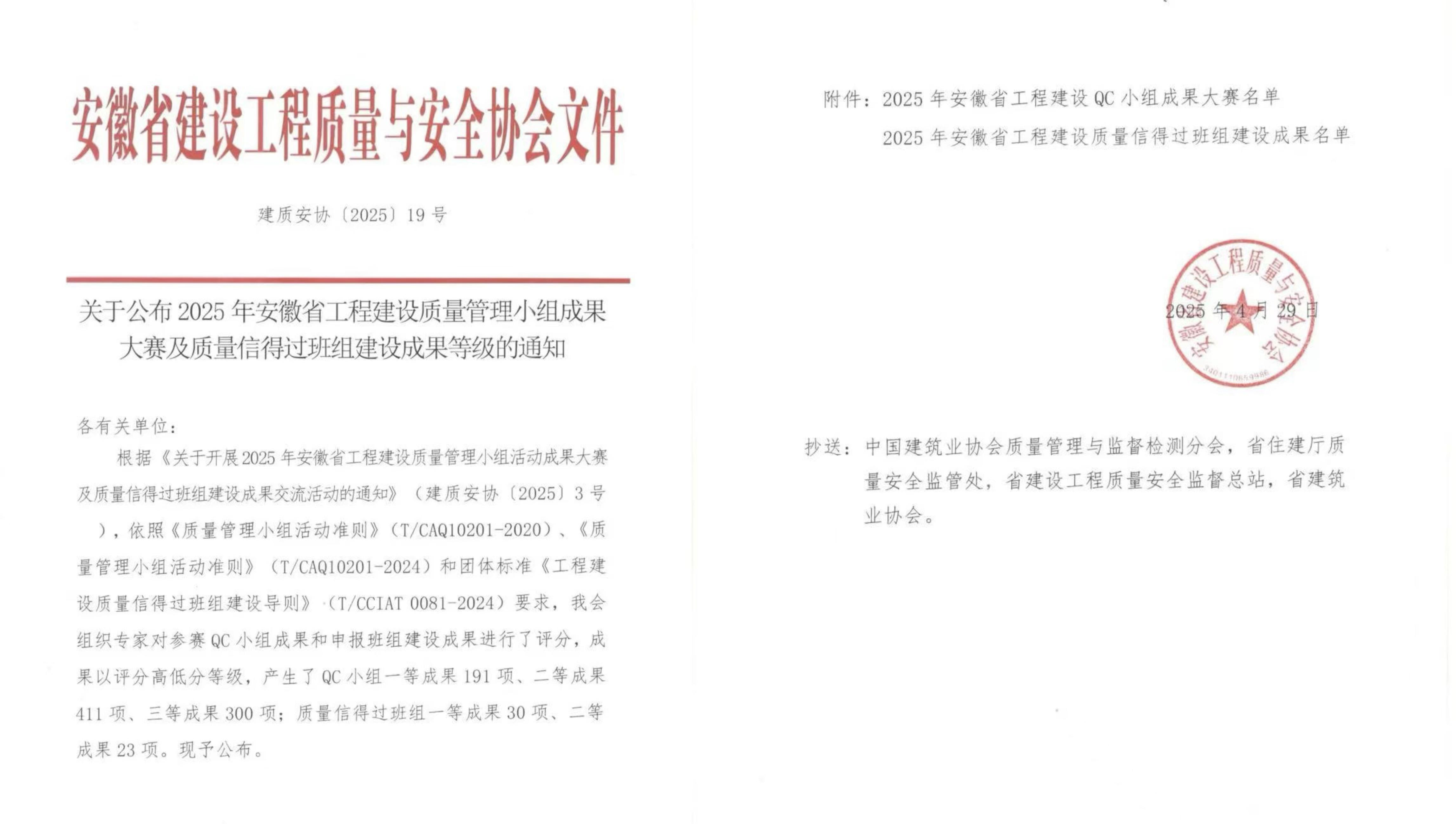 近日,2025 年安徽省工程建設 QC 小組成果大賽評選結果揭曉。建工交航斬獲 2 項省級一等獎、9項省級二等獎、14項省級三等獎。